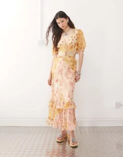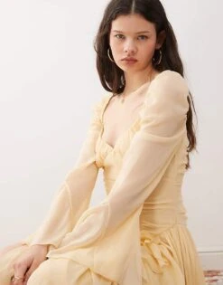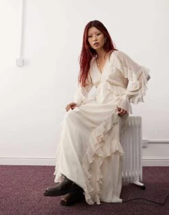 Reclaimed Vintage Maxi Dress With Pull Sleeve And Ruched Bodice In Antique Cream For Women Beige