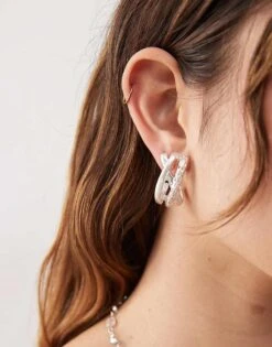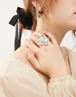 Reclaimed Vintage Statement Floral Ring With Crystals In Silver For Women