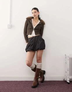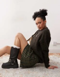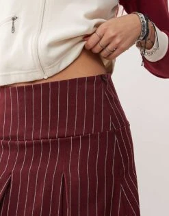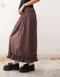 Reclaimed Vintage Prairie Midi Skirt With Frill Hem And Shirring In Burgundy Check For Women Multi
