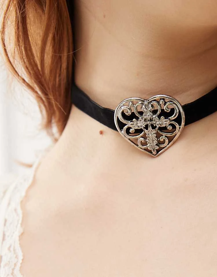 Reclaimed Vintage Choker Necklace In Black Velvet With Heart For Women Silver