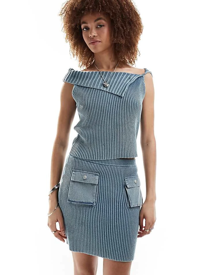 Reclaimed Vintage Knitted Bardot And Skirt In Acid Wash Co-ord In Blue