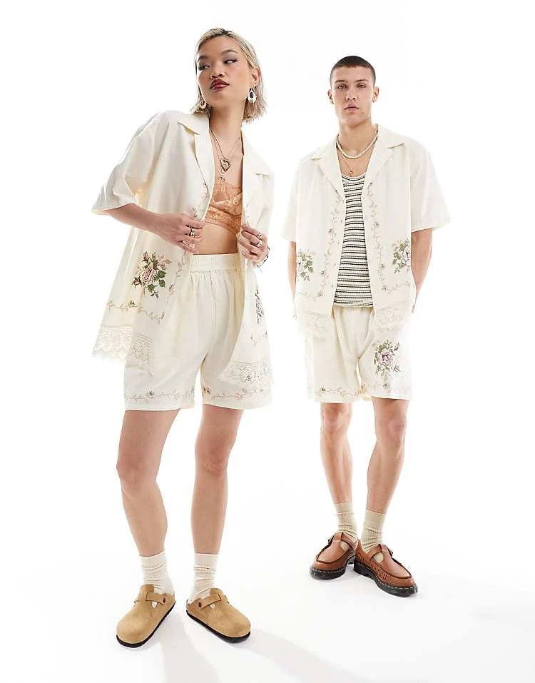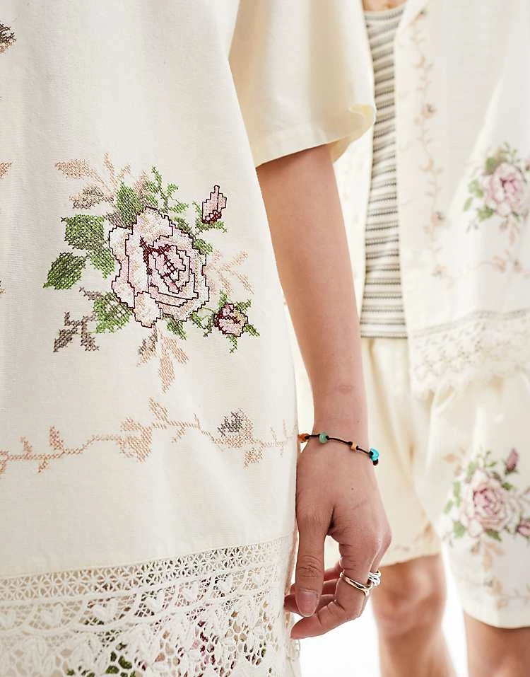 Embroidery Thread: 100% Polyester, Main: 93% Cotton, 7% Linen, Trim: 100% Cotton.